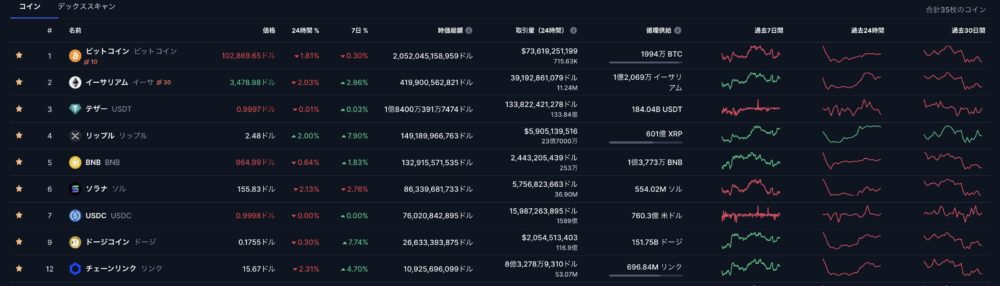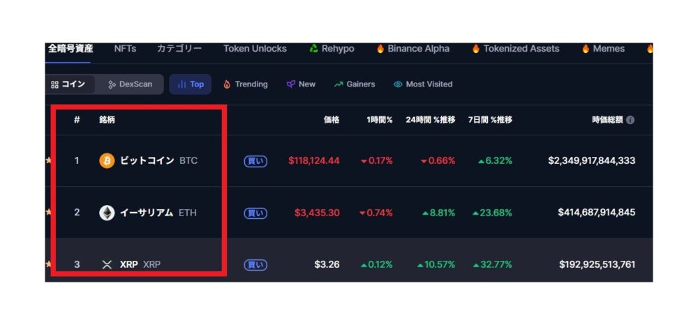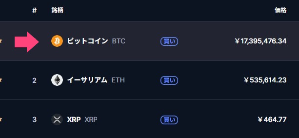 値段の高い順ではなくて、時価総額の高い暗号資産がランキング上位に来ます。