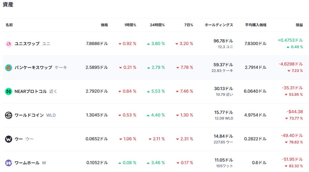 表の右から2列目の平均購入価格は購入した価格で、ユニスワップでいうと7.83$のときに購入しています。