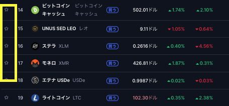 ウオッチリストへの入れ方は、チェックしたい暗号資産の左の星マーク☆をクリックするだけ。