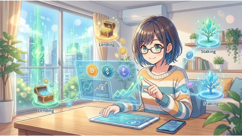 DeFiとは、暗号資産を使って運用すること全般を指します。たとえば、持っているコインを取引所に貸し出して利息をもらう「レンディング」や、コインを預けて年利を得る「ステーキング」などがあります。