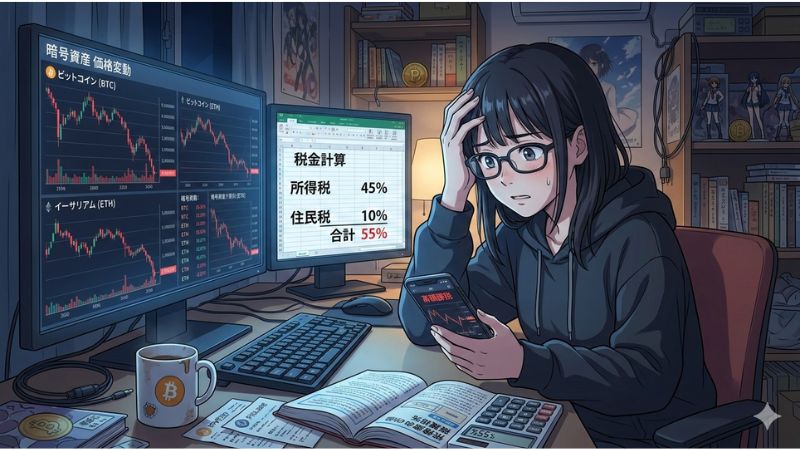 いま現状は暗号資産で得た利益にたいしての、税金は高いです。所得税と同じ値なので最高で45%とられて、プラス住民税を10%取られるので、合計で55%課税されます。